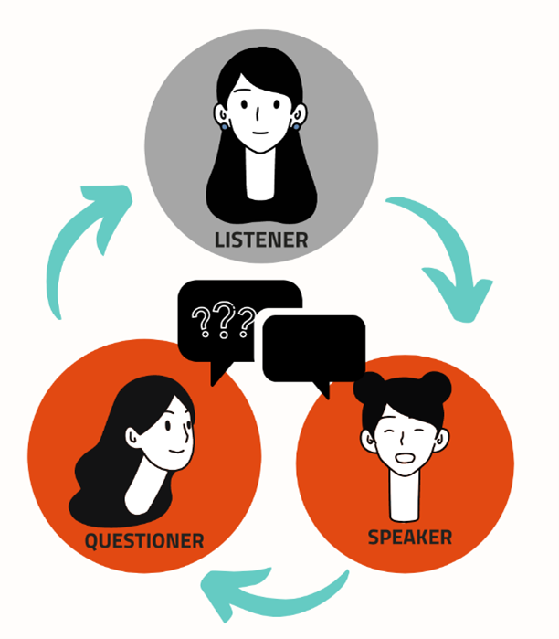 After the first round (13 minutes) it's time to move in a circle and change the roles. Participants are recommended to move physically and change their sitting positions. For example, listener moves to speaker seat, speaker moves to questioner seat and questioner moves to listener seat. When everyone has changed their positions, it is time to begin the process again. Repeat it one more time, so everyone would have a chance to participate in different roles. At the end ask in teams of 3 to reflect their experience. You might suggest to discuss in these questions: